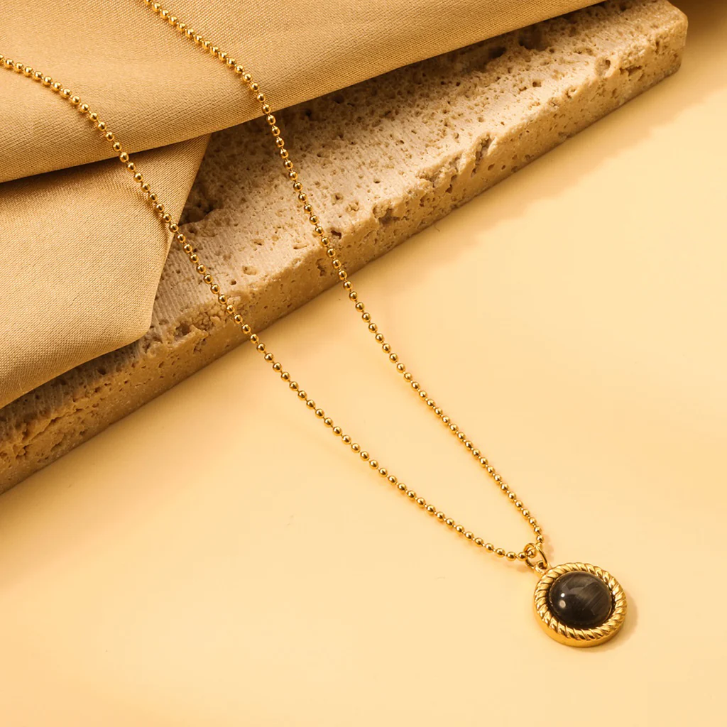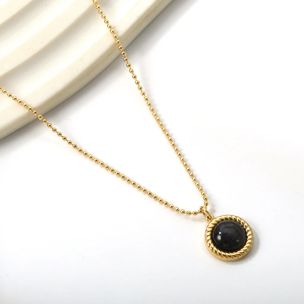 This necklace stands out with its sleek black round stone, framed in a textured gold-tone stainless steel setting. The contrast between the dark stone and warm metal adds a modern and slightly mysterious touch. It’s a stylish accessory that works effortlessly with both casual and polished looks.