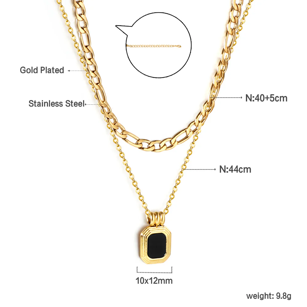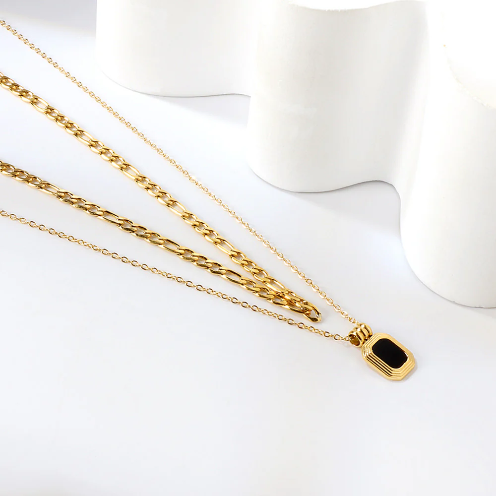 This necklace features a sleek gold-plated stainless-steel chain paired with a bold black-stone pendant. The contrast between the dark stone and warm gold tone creates a striking yet elegant look. Designed to stand out without being overpowering, it’s a versatile piece that complements both everyday outfits and more polished styles.