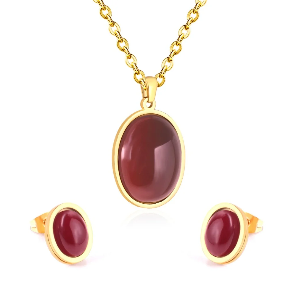 Rich burgundy stones paired with warm gold-tone stainless steel give this necklace and earring set a striking and sophisticated look. The deep color creates a dramatic contrast that feels both modern and elegant. Perfect for evening events or adding depth to contemporary outfits, this set is designed to stand out with confidence.