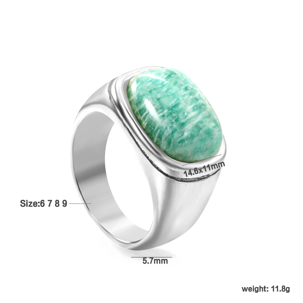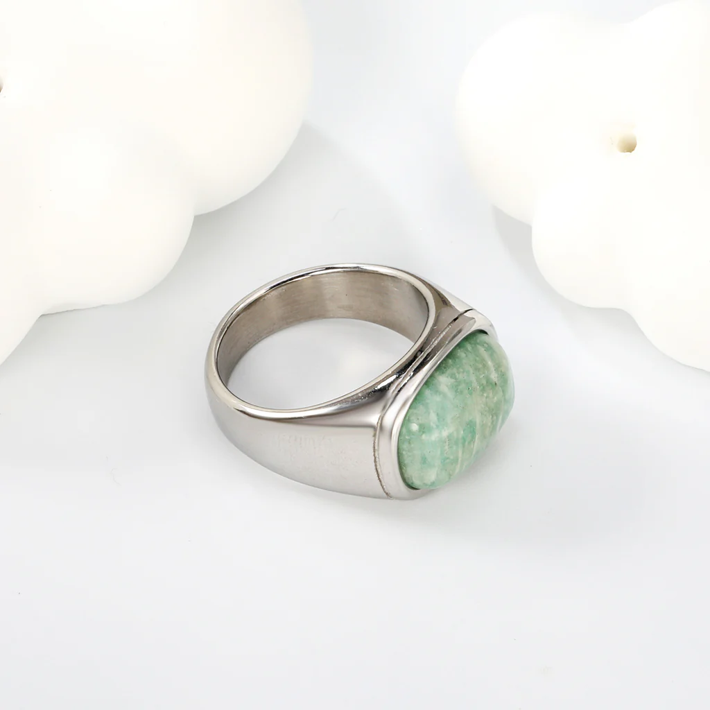 This statement ring features a smooth silver-toned band set with a large oval green-blue stone. The gemstone displays beautiful natural marbled patterns that resemble ocean waves, giving the piece a unique and organic feel. Eye-catching and distinctive, it’s designed to add character to your jewelry collection.