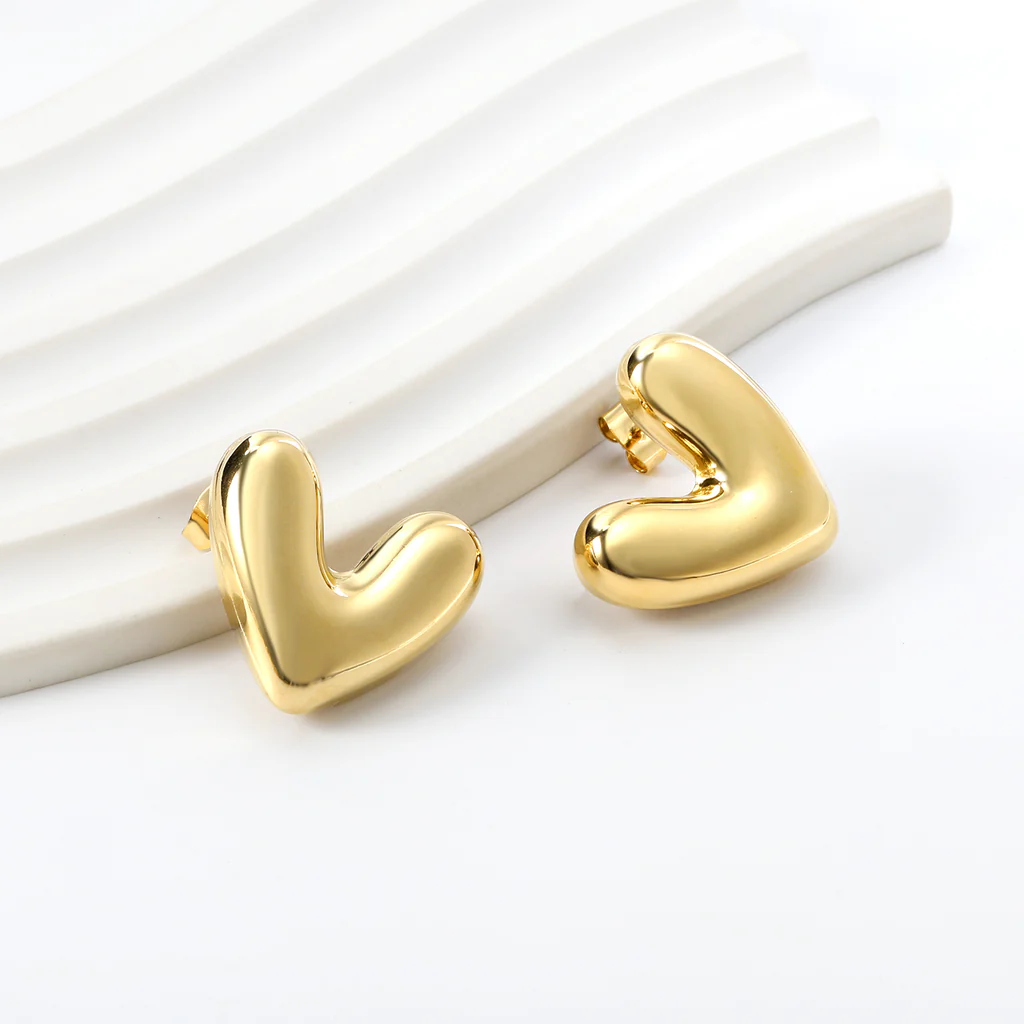 These gold-toned stud earrings feature polished heart shapes with smooth domed surfaces. The sculpted design gives them a soft, dimensional look that catches the light beautifully. Simple yet charming, they’re perfect for adding a subtle romantic touch to your style.