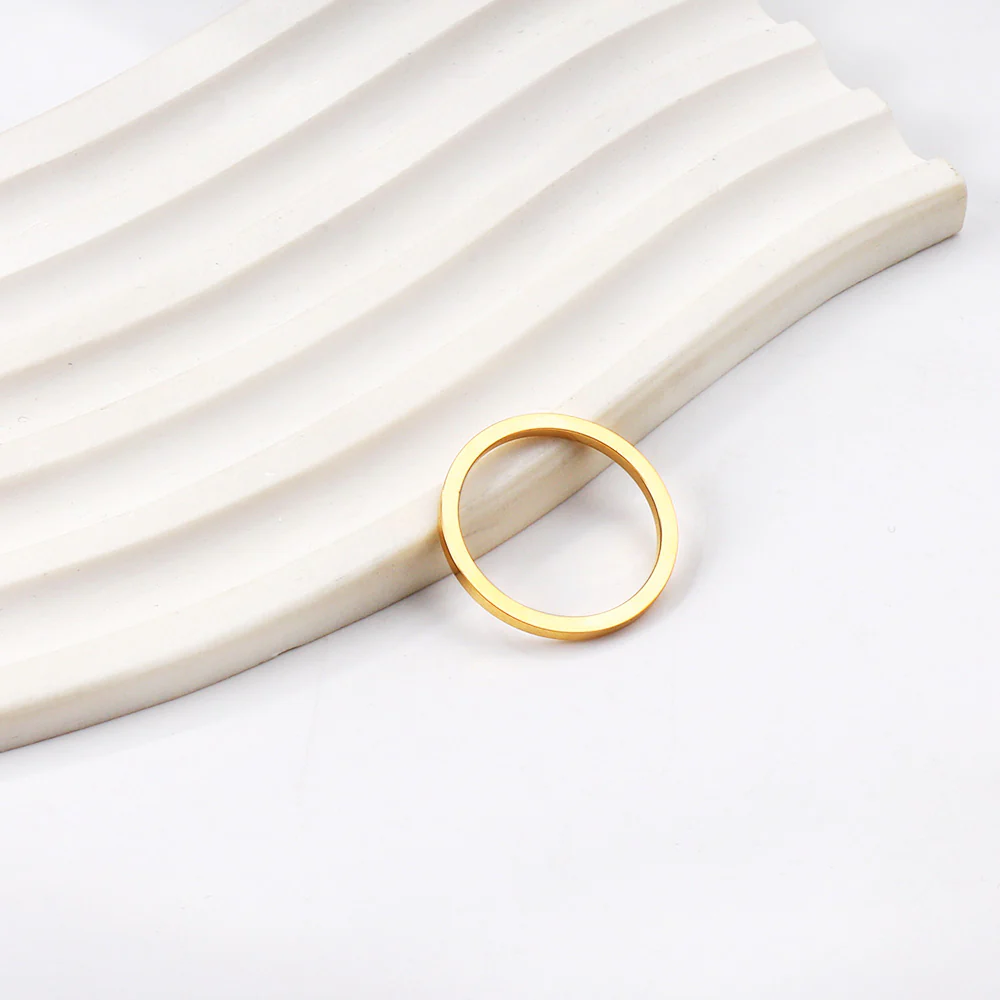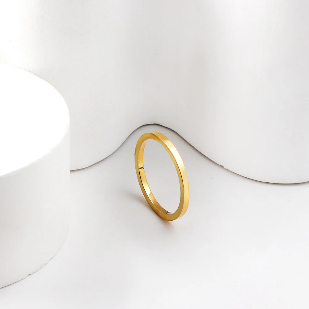 Clean and contemporary, this gold-toned ring features a narrow band with a flat, polished surface and crisp edges. The minimalist design creates a sleek and modern appearance. Perfect for stacking or wearing alone, it offers effortless style and versatility.