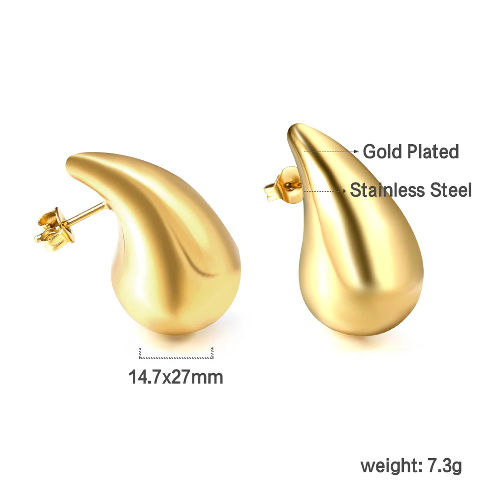 These gold-toned stud earrings feature a sculpted teardrop shape with a smooth, high-polish finish. Their rounded silhouette reflects light beautifully, creating a sleek and modern look. Minimal yet striking, they sit comfortably on the earlobe for everyday elegance.