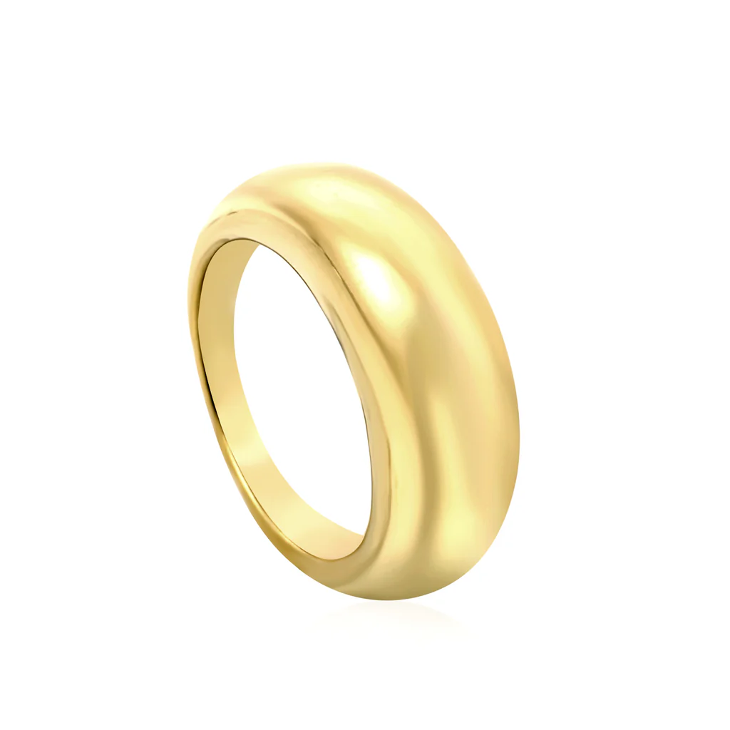 This gold-toned ring showcases a wide, rounded dome shape with a flawless high-polish finish. Its bold silhouette creates a modern statement while maintaining a clean and minimalist aesthetic. Designed to stand out on its own, this ring brings a contemporary edge to your jewelry collection.