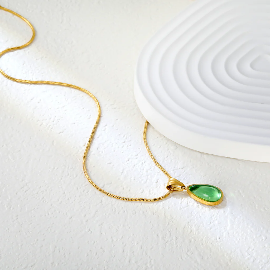 Fresh and vibrant, this necklace showcases a beautiful green teardrop stone set within a gold-tone stainless steel frame. The lively color brings a natural energy to the design, making it a standout accessory. It’s perfect for adding a subtle pop of color and elegance to your look.