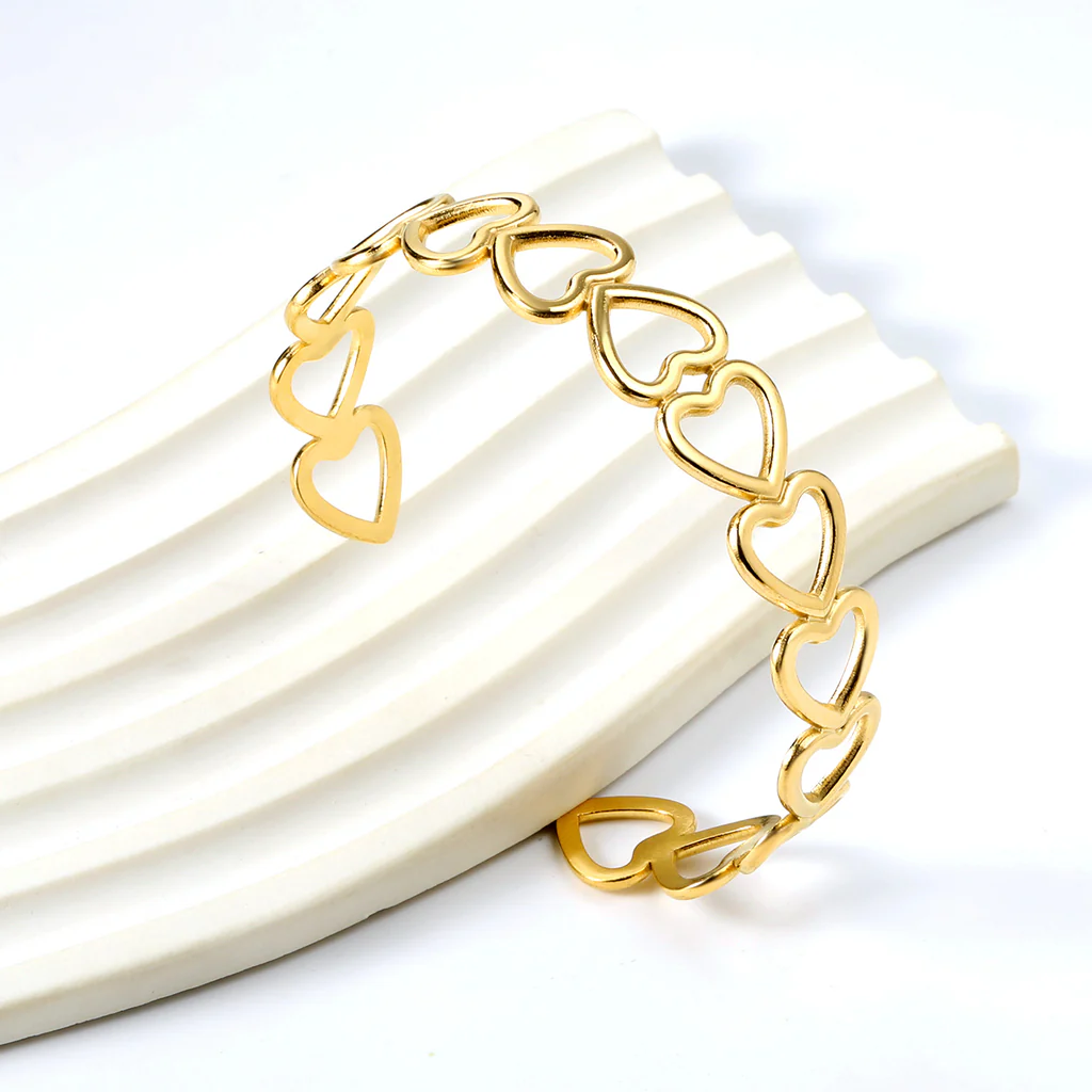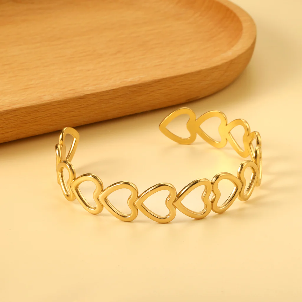 This elegant cuff bracelet features a delicate design made from interconnected heart-shaped links. The pattern creates a romantic and graceful look that feels both subtle and stylish. It’s a beautiful piece that adds a soft feminine touch to your accessories.