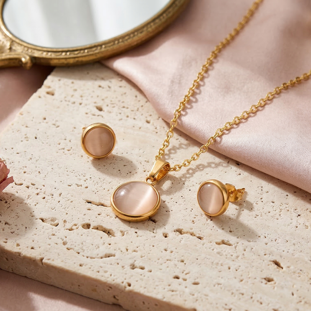 Soft, luminous, and effortlessly elegant, this necklace and earring set features beautiful mother-of-pearl stones set in gold-tone stainless steel. The natural glow of the stones creates a refined and delicate look. Whether worn with everyday outfits or for special occasions, this set adds a graceful touch of understated luxury.