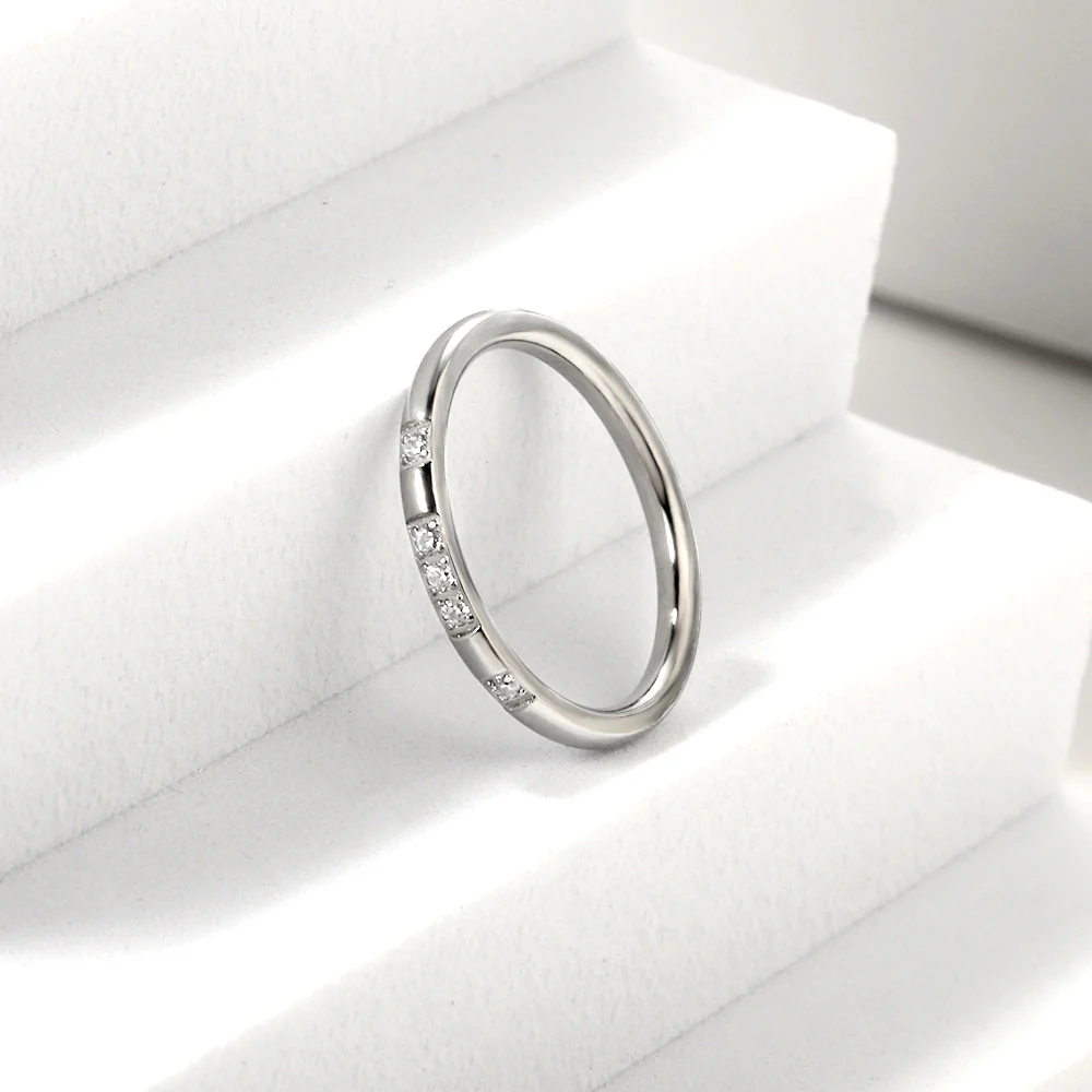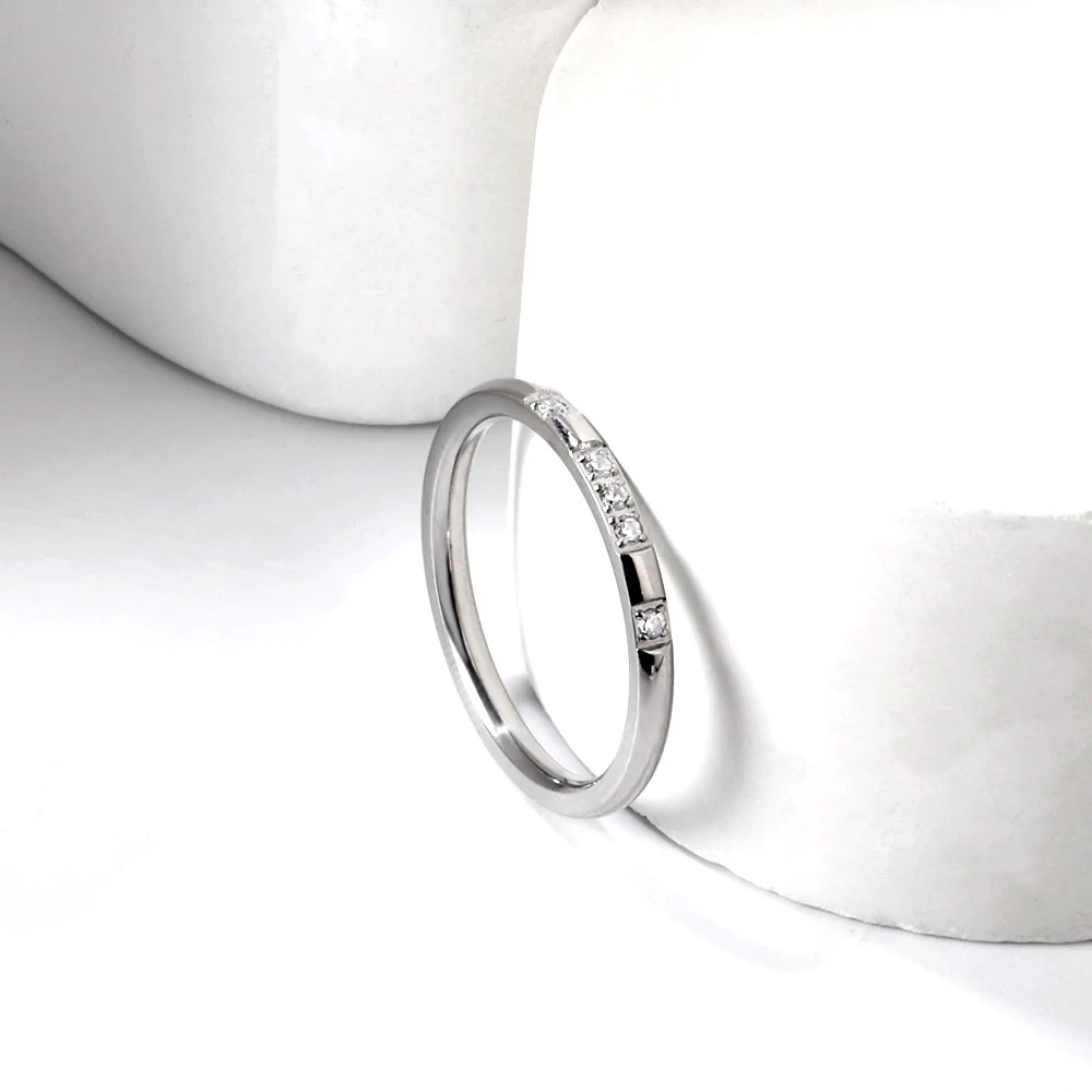 This elegant silver-toned band features a row of small, clear stones set neatly across the top surface. The stones are evenly spaced, creating a clean and balanced design. Subtle yet sparkling, it’s perfect for adding a refined touch to everyday wear.