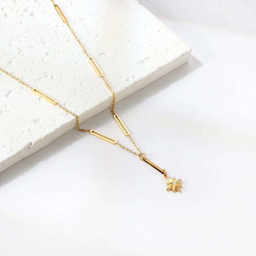 Add a touch of celestial charm with this elegant star pendant necklace. The delicate gold-plated stainless steel chain is accented with small bars that create a unique and stylish look. Playful yet refined, this piece brings a little sparkle and personality to everyday outfits.